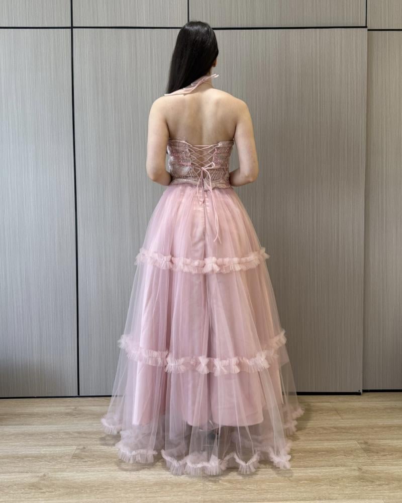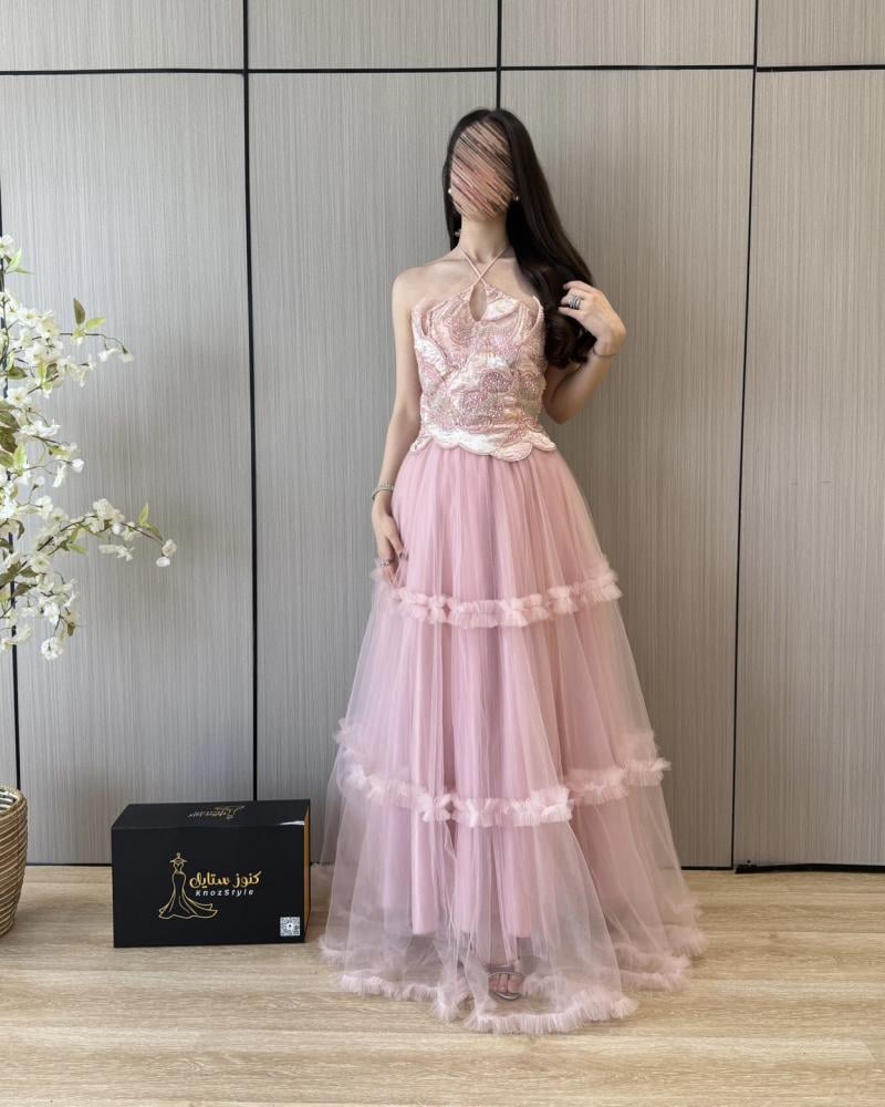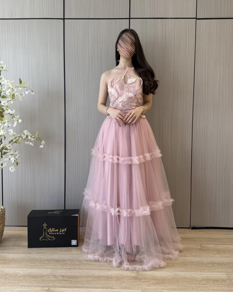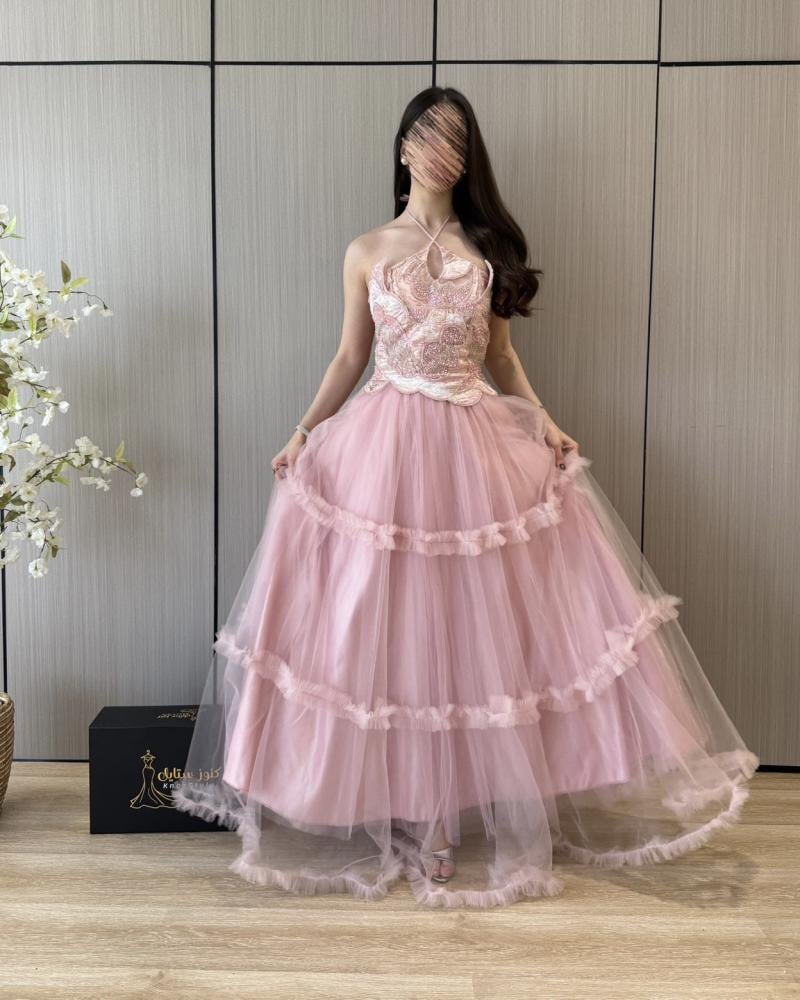 فستان سهرة وردي فاتح طبقات ومطرز