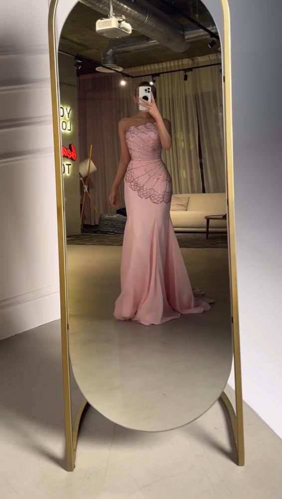 فستان سهرة طويل بلون وردي فاتح، بقصة حورية البحر، مع تطريزات لامعة.