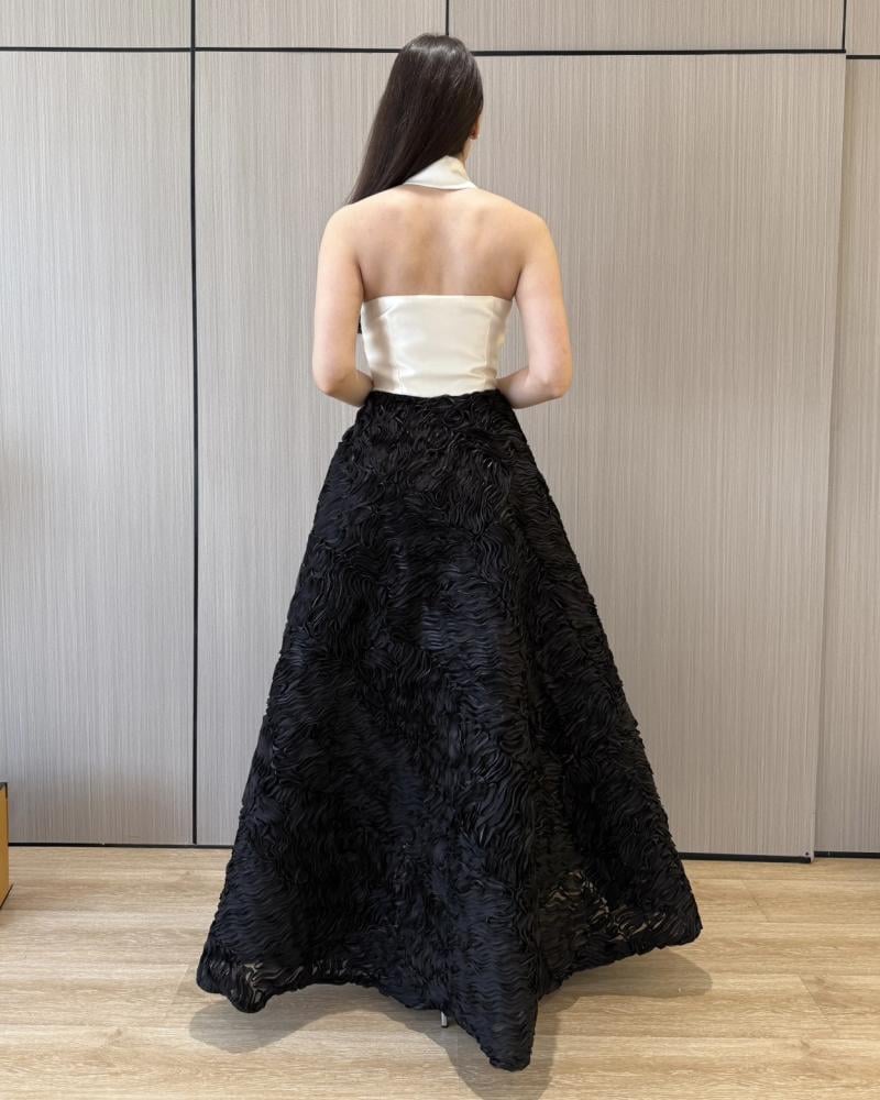 ​التنورة (Skirt): تأتي التنورة بقصة واسعة وكاملة (Full A-line or Ball Gown style) باللون الأسود الغني. الملمس هو السمة الأبرز هنا، حيث تتميز بتفاصيل ثلاثية الأبعاد (3D texture) بارزة تشبه الورود أو الزخارف المنسوجة، مما يمنحها قوامًا دراماتيكيًا وفريدًا.