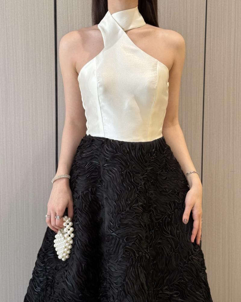 ​التصميم: يجمع الفستان بين التباين الجريء للأسود والأبيض ليخلق إطلالة لافتة ومناسبة للمناسبات الكبيرة مثل حفلات الزفاف، الحفلات الرسمية، أو السهرات الراقية.