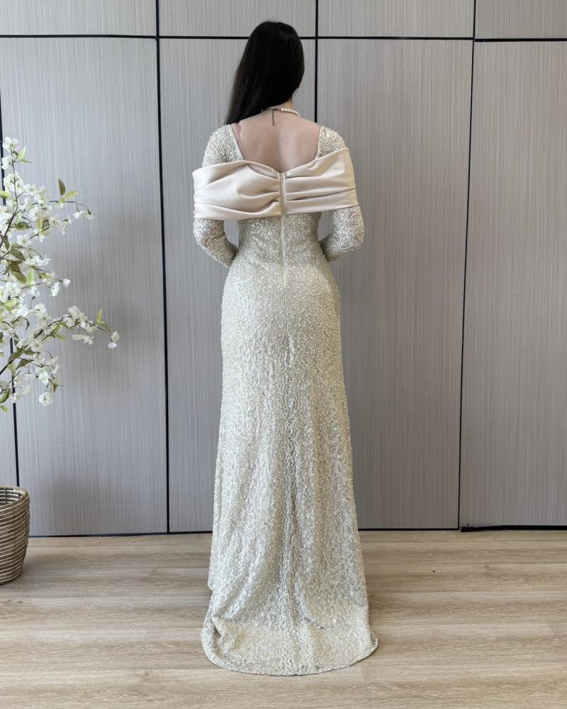 ​الجسم والأكمام: الفستان بالكامل مرصع بتطريز كثيف من الترتر (Sequins) اللامع بنفس اللون أو بلون فضي خفيف. التطريز يغطي القماش الأساسي بالكامل في نمط متشابك ومضيء، مما يعطي إحساسًا بالبريق المتلألئ.