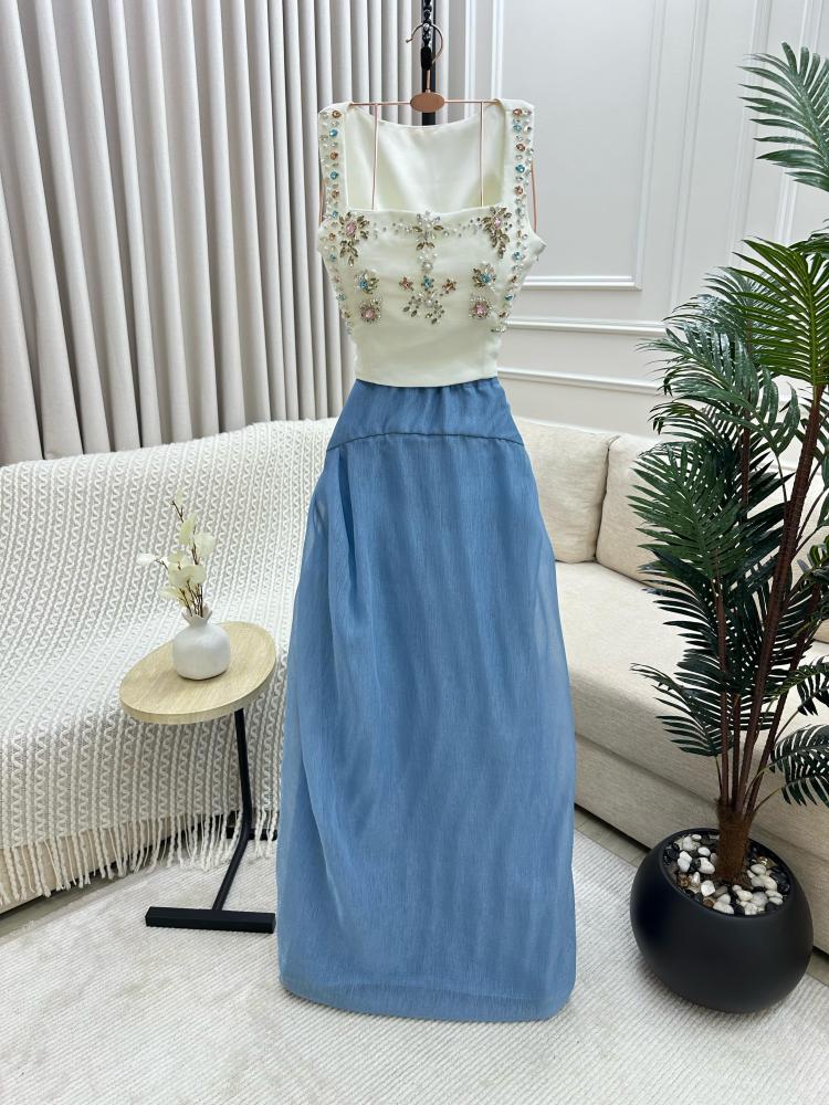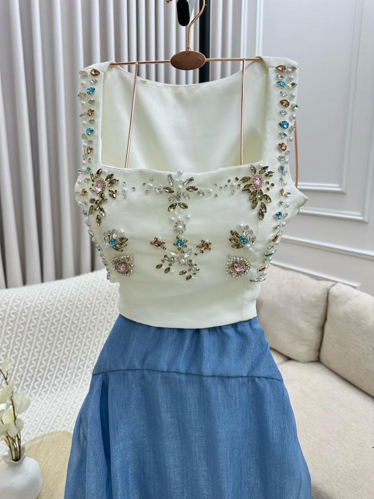 - الألوان: الفستان يأتي بلون ملون ابيض وازرق الذي يعكس ذوقك الرفيع ويبرز جمالك.