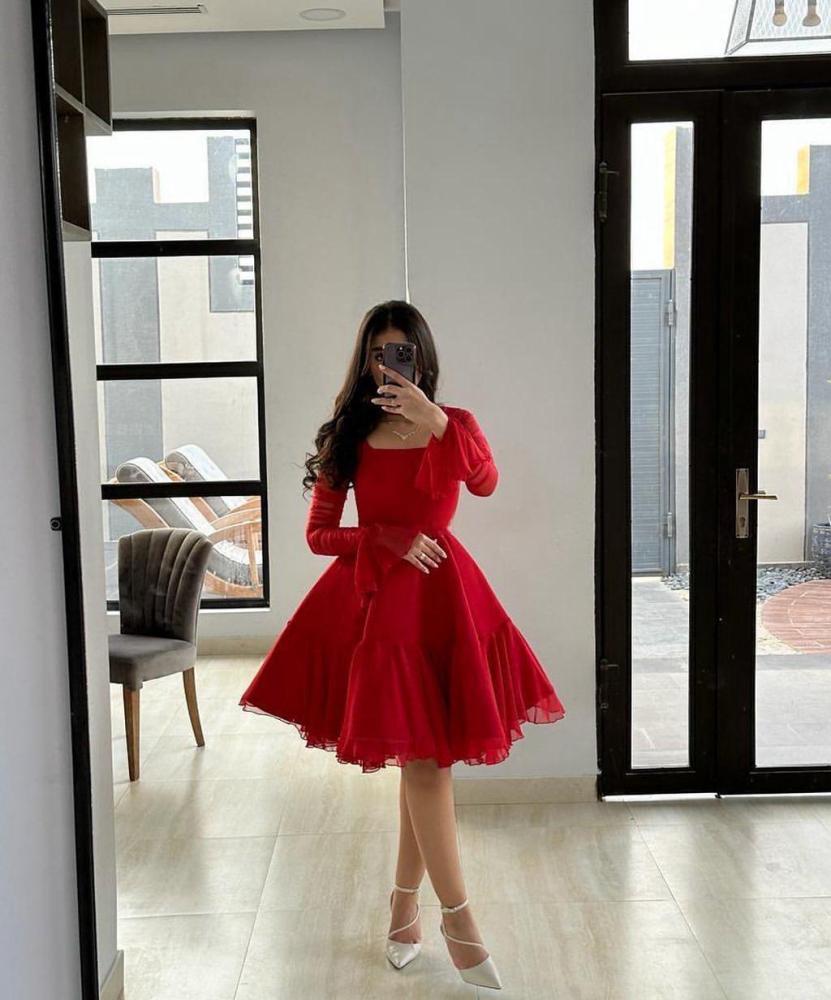 استعدّي ليالٍ ساحرة وأناقة لا تُضاهى مع فستان كنوز الجديد قصير لامع المذهل المزيّن بقصة ساحرة حيث يأسر الأنظار بتصميمه العصري والأنثوي