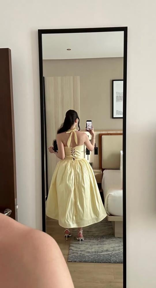 فستان بلون أصفر فاتح (ليموني) بفتحة صدر مربعة، وقصة واسعة تصل إلى منتصف الساق.