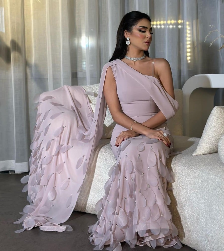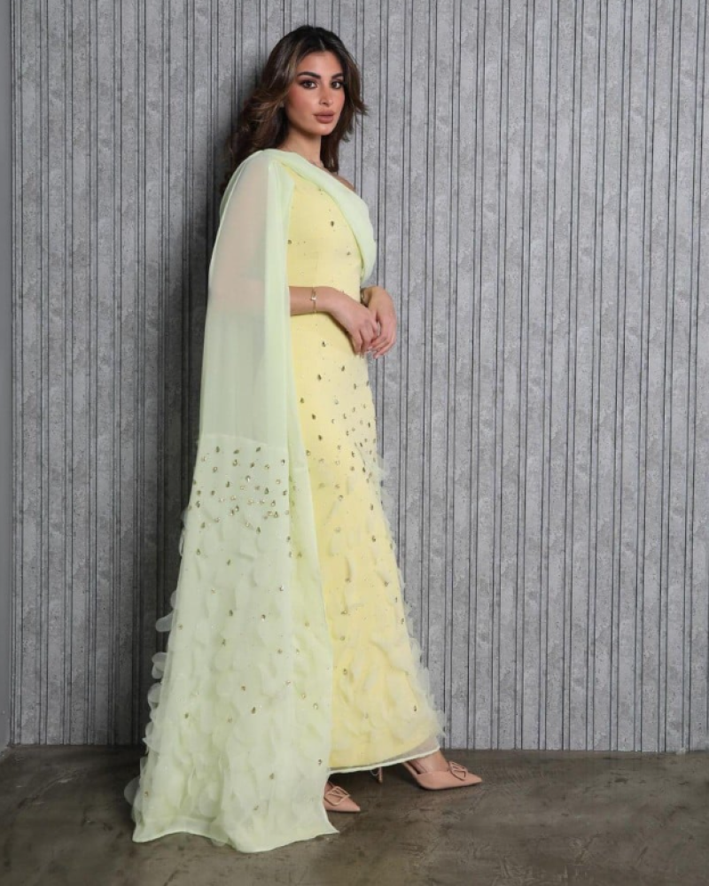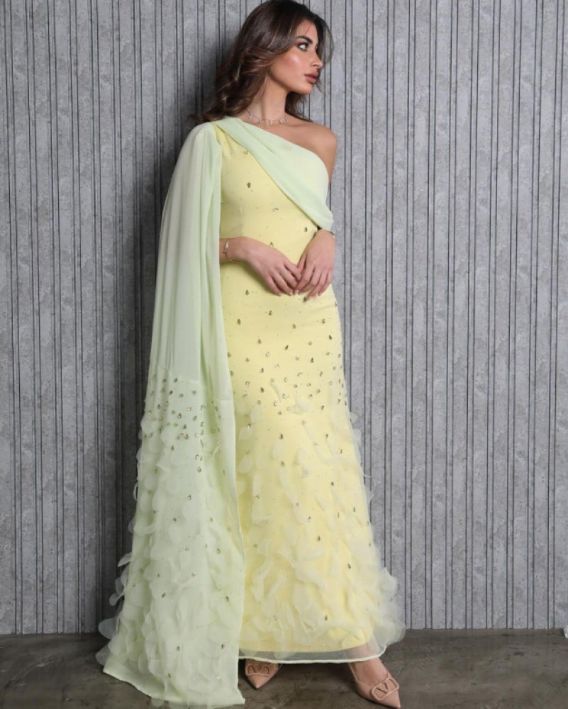 استعدّي ليالٍ ساحرة وأناقة لا تُضاهى مع فستان كنوز الجديد طويلة لامع المذهل المزيّن بقصة وبفصوص ساحرة حيث يأسر الأنظار بتصميمه العصري والأنثوي